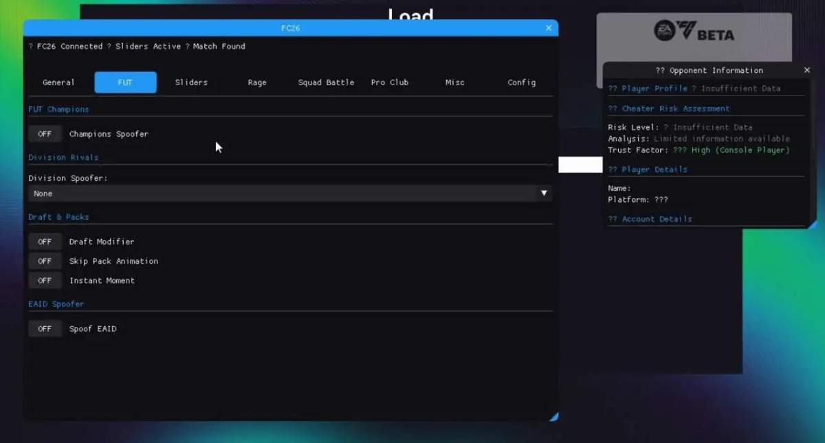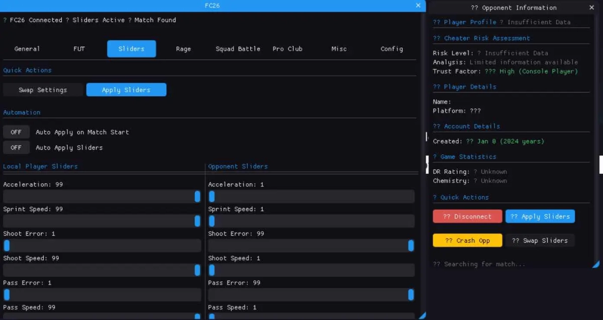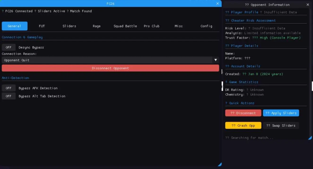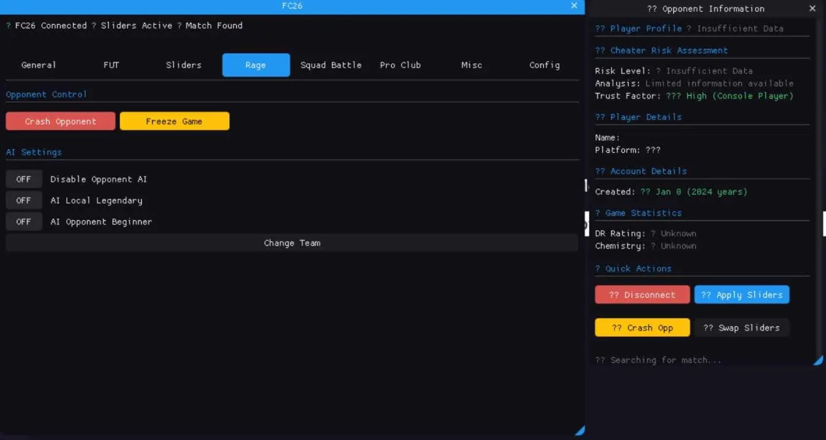 Administrators Lavi Posted January 13, 2025 Administrators Share Posted January 13, 2025 (edited) -Support Amd/ Intel both -Support Win11 &10 [ All Version upto 25h2] F E A T U R E S Ultimate Team (Rivals, Champs, etc) NoLoss – Prevent a loss from being registered (Misc tab). Opponent Name/Platform – This option is activated automatically and cannot be deactivated, it will show the username + platform of your opponent (PC/PS5/XBOX). Division Spoofer – Same as draft modifier, you can increase/decrease the division you want to play in. The value of 0 disables it. Works in Elite as well. Example: spoof from Division 1 → Division 9/8 for easier matches. Wins count for promotions, weekly/season rewards, or objectives. Champions Round Spoofer – Spoof your round in FUT Champions. Camera Settings – Customize camera angles for a more fun and unique experience. Squad Battles Time Changer – Modify match time, end match instantly, etc. Ball Teleport – Score with a single button press. General Desync Bypass – Prevents the game from kicking you during server desyncs. Bypass ALT TAB – No more disconnects or crashes when alt-tabbing. Draft Round Modifier – Spoof your round in draft to face players with 0 wins. Skip Pack Animation – Don’t waste time opening all your packs. Instant Moment – Finish moments challenges with one click. Spoof EA ID – Don’t let your opponent know who you are. General (Advanced) Sliders (Pro Clubs / Squad Battles / Seasons) Activate in UT menu to make opponent play badly/slower. Local Sliders: Turn bronze players into 99 OVR safely. Opponent Sliders: Reduce opponent stats (e.g., R9 into bronze, slower players, weaker goalkeepers, etc.). Disconnect Match – Ends the match for both sides. If leading, you win; if losing/draw, match cancels. ⚠ Risky feature, use at own risk (mainly for coin farming). Disconnect Reason – Choose a reason for opponent. Disconnect – Instantly end game, appears as if opponent quit. Desync Bypass – Prevents disconnection during server desync. Disable Opponent AI – Opponent’s players won’t move. Rage Crash Opponent – Force opponent’s game to close (counts as loss for them). Anti-Crash – Protects you from crash attempts. Freeze Opponent Game – Freeze opponent’s screen mid-game. Pro Clubs AI Auto Play – Let AI play during Pro Club matches. XP Boost – Gain XP faster for quicker progression. Unlock ALL Playstyles – Instantly unlock every playstyle. Edited October 25, 2025 by Brian23 4 1 Link to comment