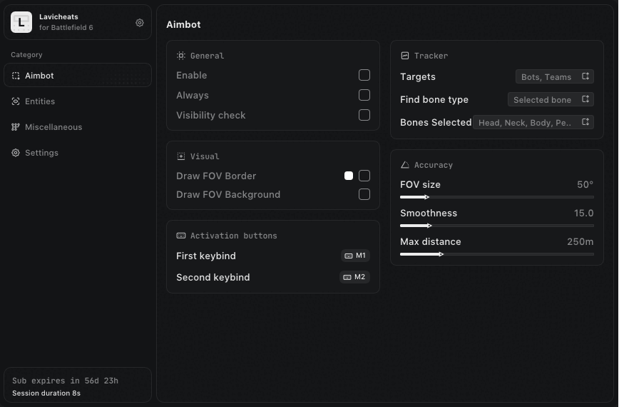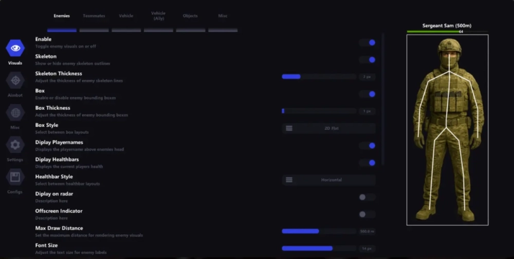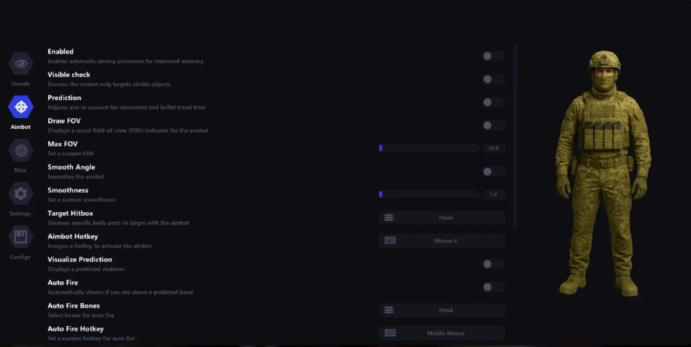 -Supports Windows 10 : (all versions) /Windows 11 supported (all versions upto 25h2). - Steam version only Features: AIMBOT Visibility check Player / bot checker Draw FOV Border Aim key selector Aim smooth variable Controller support Targets: (Players, Bots, Teams) Bone: (Head, Neck, Body) FOV Size Max distance Visuals Bounding box: (Box, Corner) Fill box 2D /3D Skeleton esp Line to enemy: (Color, Position) Health bar: (Static, Health based, Gradient) View line Name Distance Draw teammates Bot transparency Max distance Misc 2D radar Colorful palettes