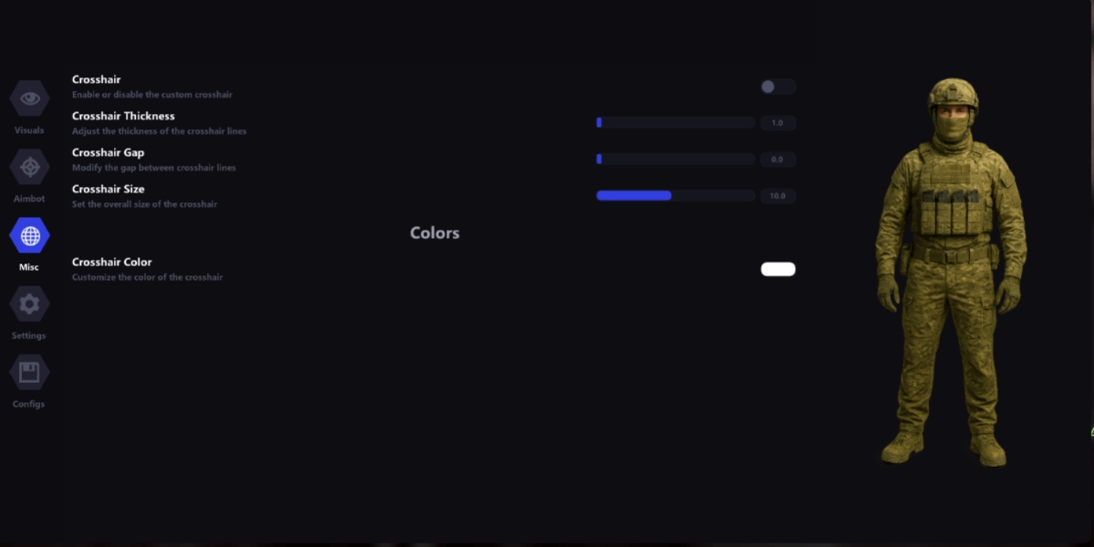 -Supports Win 11 & Win10 [All Versions] 25h2 included -Supports Both Amd/Intel Features: AIMBOT Type: (On hold, Always) Targets: (Players, BOTs, Teammates) Find bone type: (Selected bone, Closest bone, Random bone) Bone: (Head, Neck, Body, Pelvis..) Multiple Aimbot Keys Visibility check Draw FOV border Draw FOV background FOV radius Smoothness Max distance Visuals Bounding box: (Box, Corner) Fill box: (Static, Gradient) Skeleton: (Thickness) Information [Distance, Name, Health bar] Line to enemy View line Draw BOTs Draw teammates BOT transparency Item Esp MISC Battle mode keybind Crosshair Menu keybind Theme (Murky, Sunny)